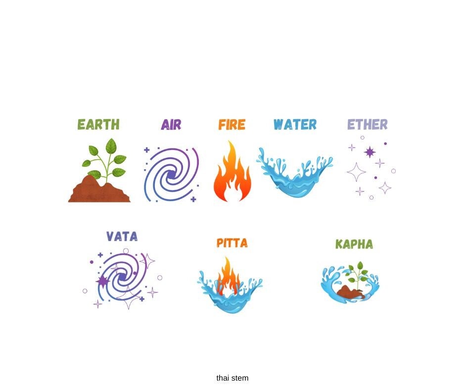 The five elements (earth, water, fire, air, and ether) are believed to combine to form the three doshas.